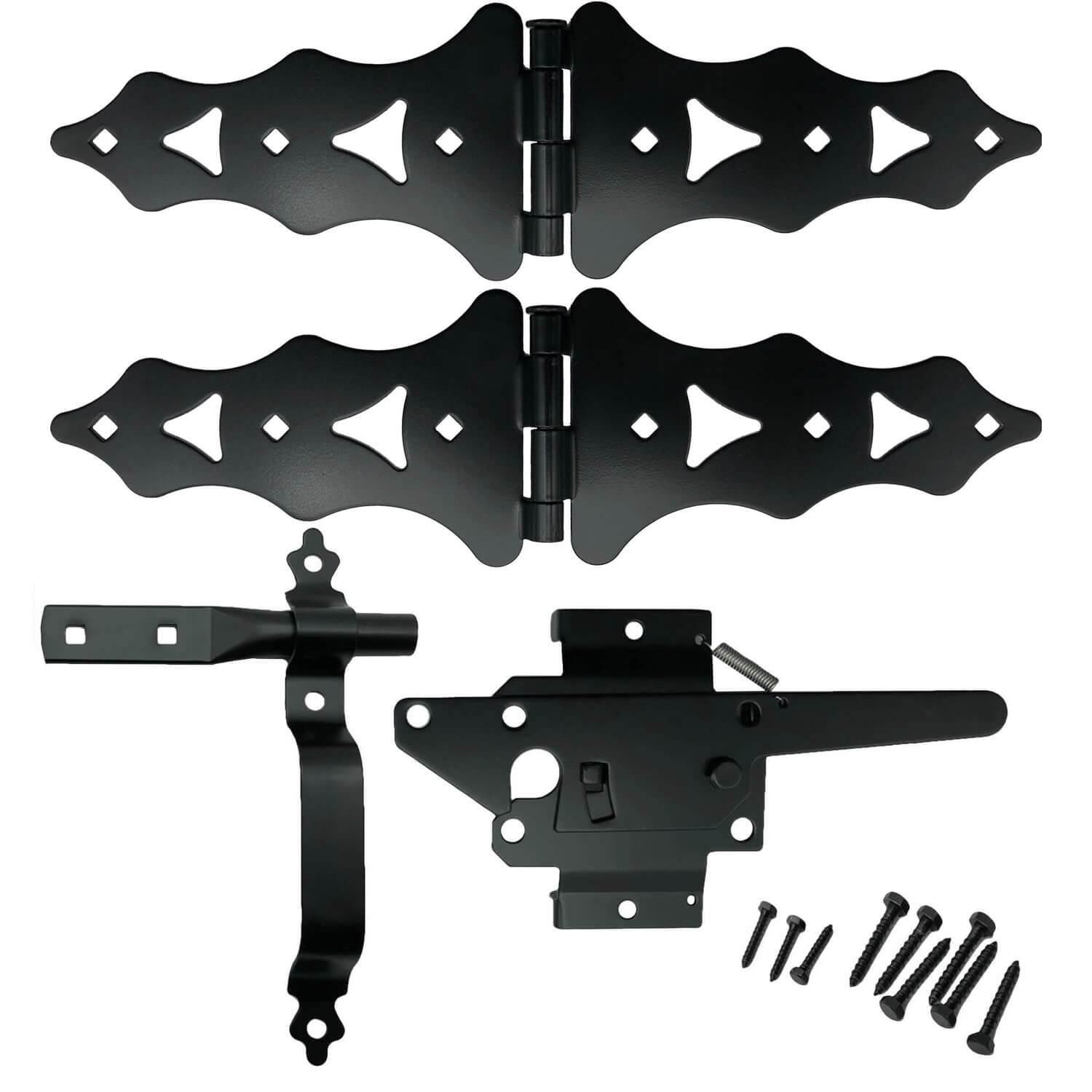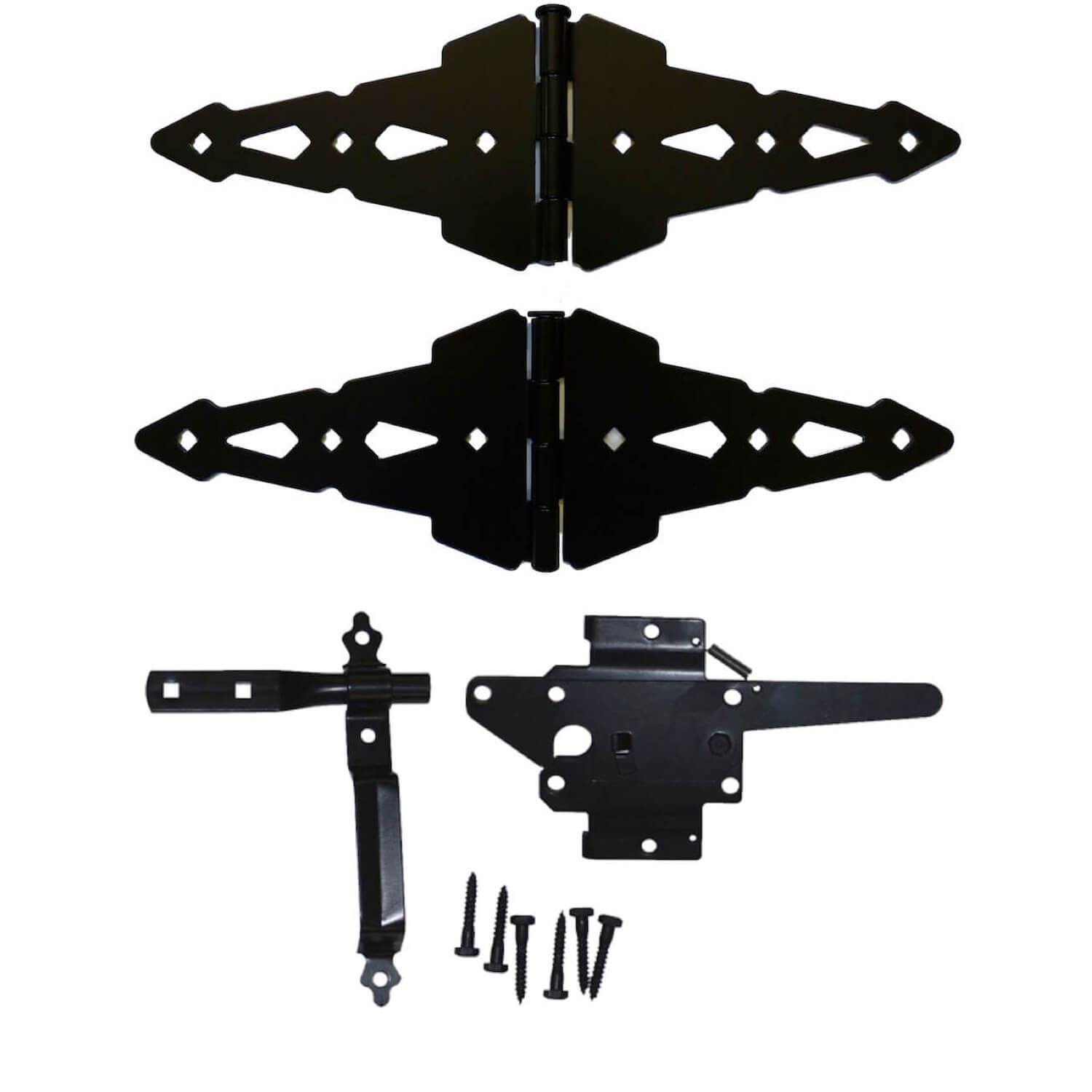 Includes 1 Pair (2) of Western Or Traditional Style Gate Hinges - Hinges Measures 8" on Each Side of the Center Pin For a 16" Total Hinge Length - Hinges Measures 5" High at the Highest Point (Center) - Includes 1 Wood Gate Latch which Operates from Both Sides and 1 Wood Gate Handle - 9" Long