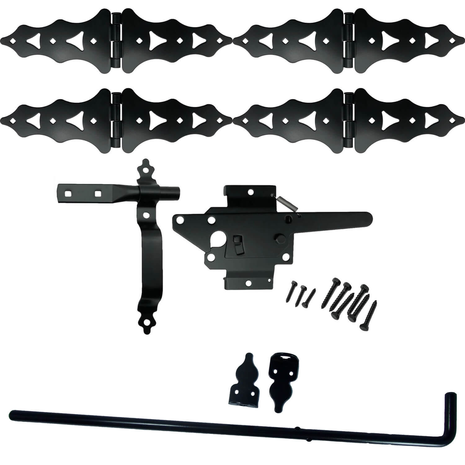 Includes 2 Pair (4) of Western Or Traditional Gate Wood Hinges - Hinges Measures 8" on Each Side of the Center Pin for 16" Total Length - Hinge Measures 5" High at the Highest Point - Includes 1 Wood Gate Latch Which Operates from Both Sides and 1 Wood Gate Handle 9" Long - Also Includes 1 Wood Gate Drop Rod/Pin With a 5/8"diameter by 24" Long